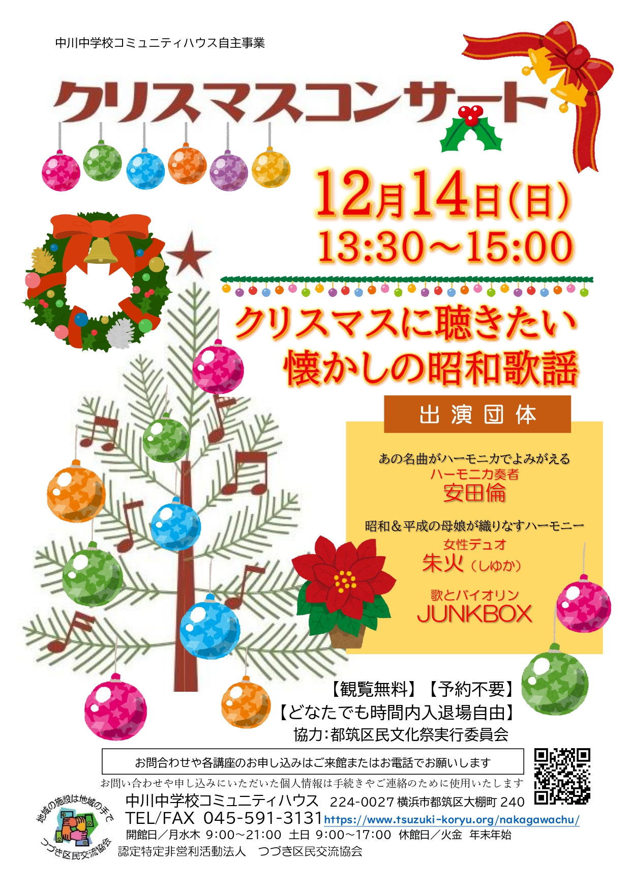 2025.12.14(日)中川中学校コミュニティハウス「クリスマスコンサート」で演奏します!